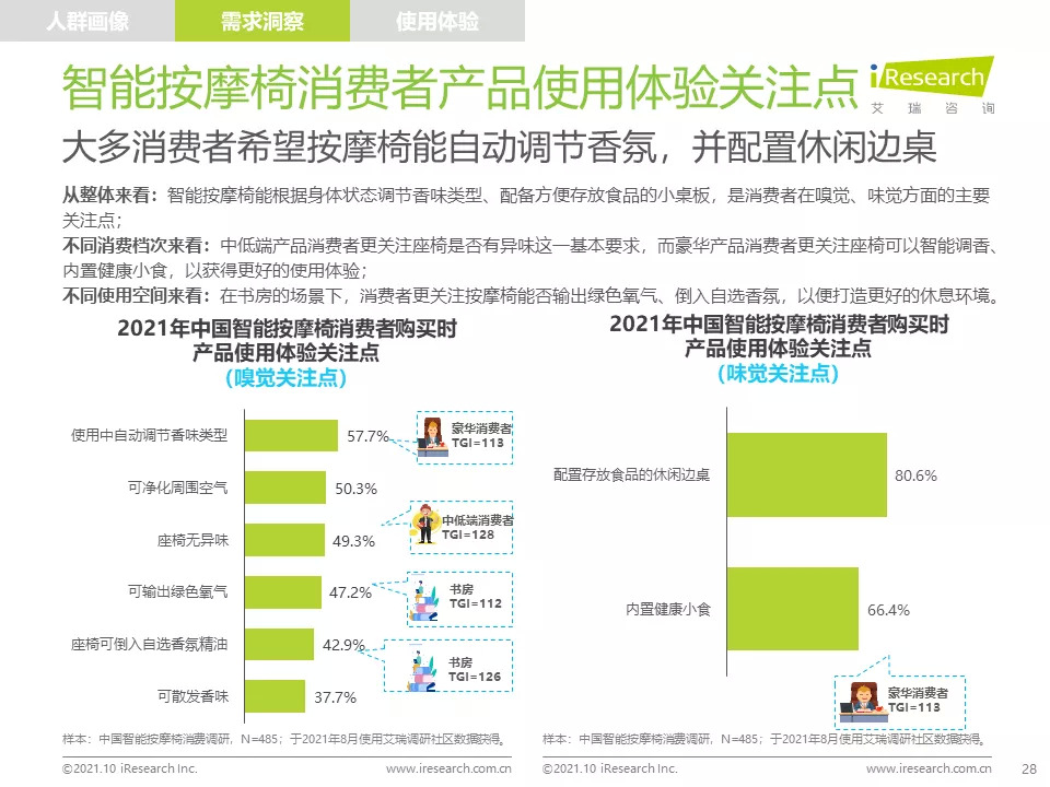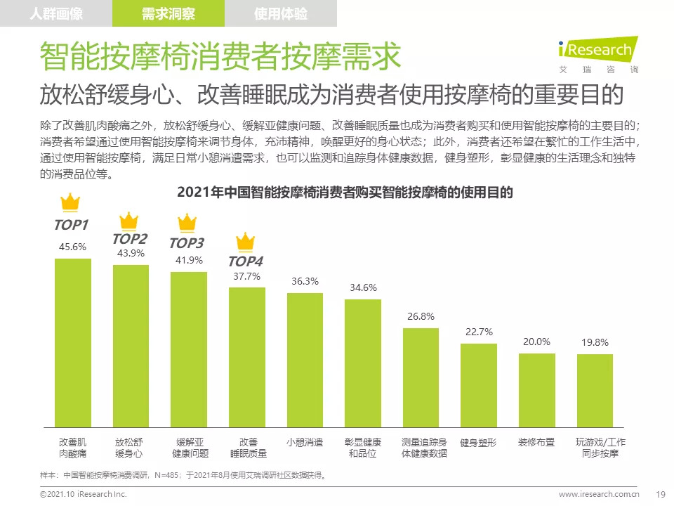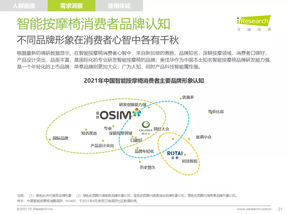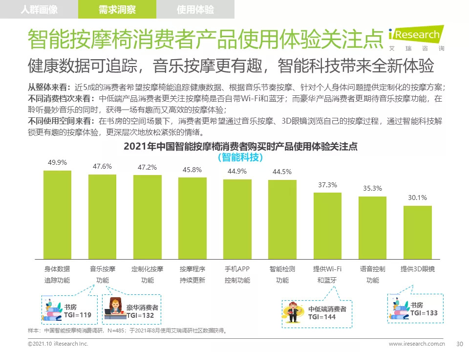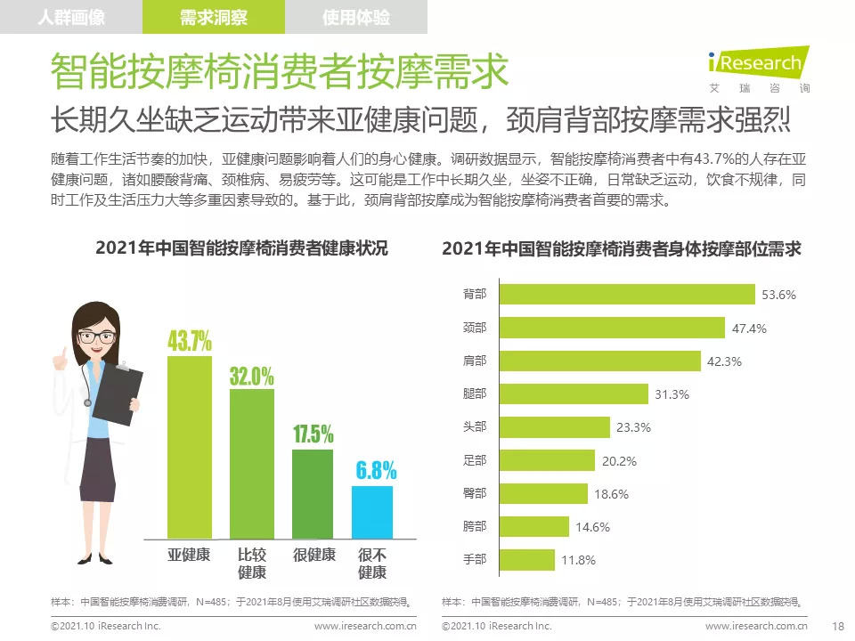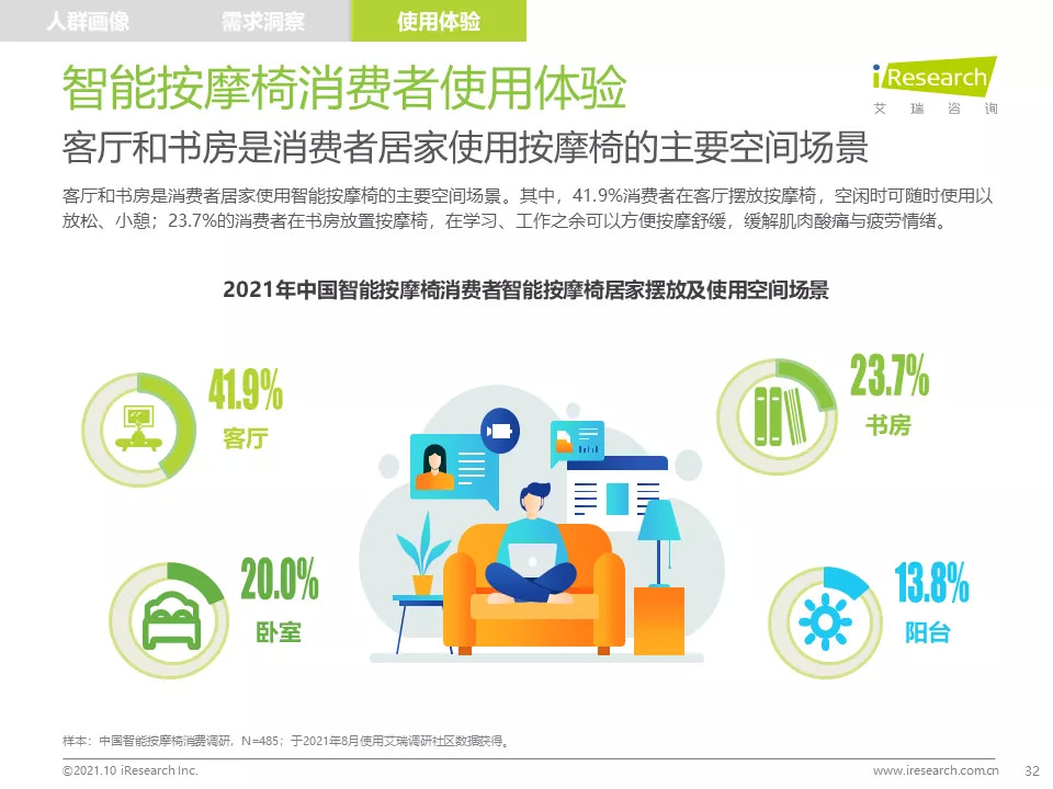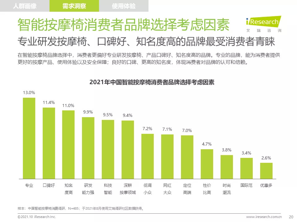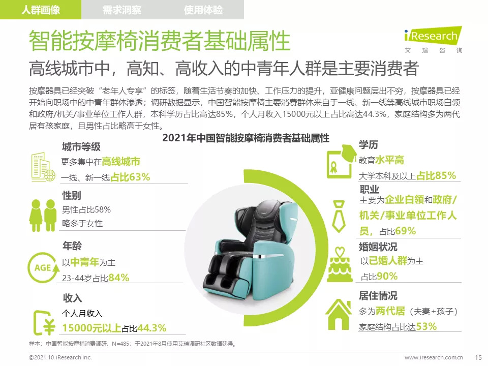 高线城市中,高知、高收入的中青年人群是主要消费者,他们拥有健康消费理念,注重品质,对知名品牌情有独钟;由于长期久坐,缺乏运动带来亚健康问题,消费者颈肩背部按摩需求强烈,也有很多消费者希望通过使用按摩椅放松舒缓身心,改善睡眠;消费者在购买智能按摩椅时,更愿意购买那些专业研发按摩椅、口碑好、知名度高的品牌产品,此外,高端及豪华消费者更喜欢智能科技感强的按摩椅产品