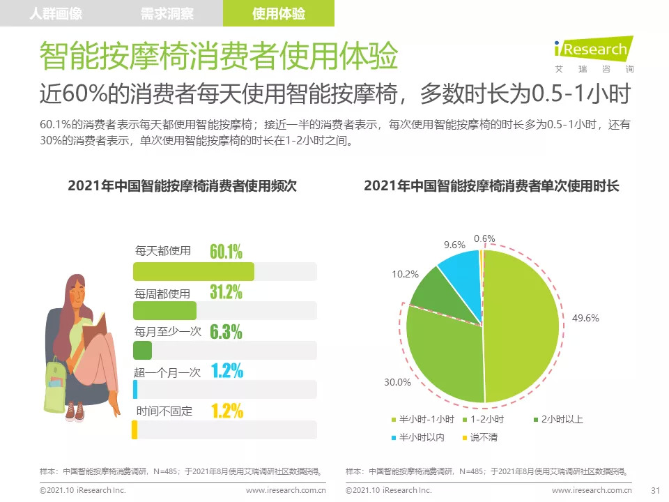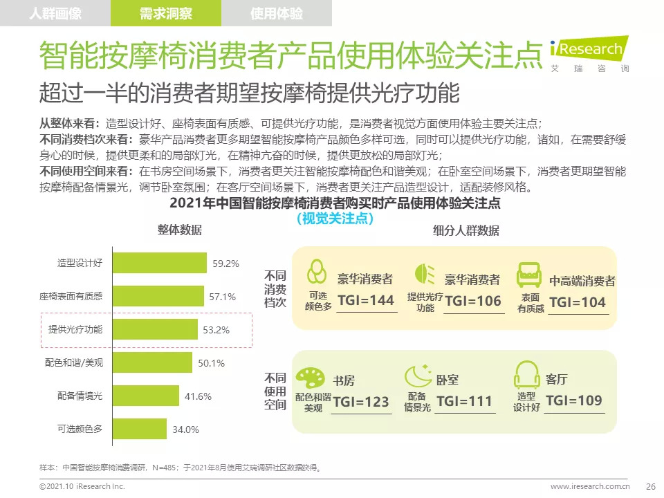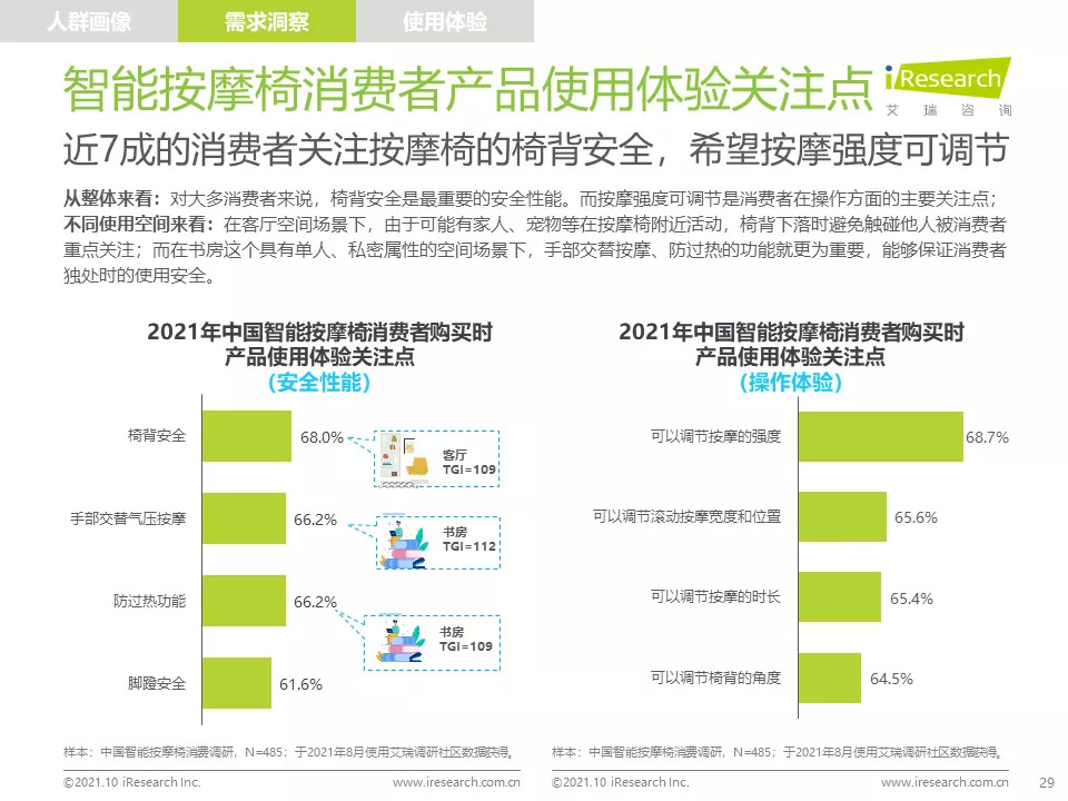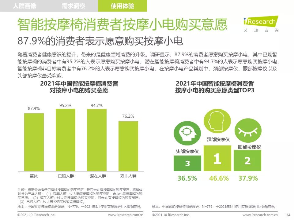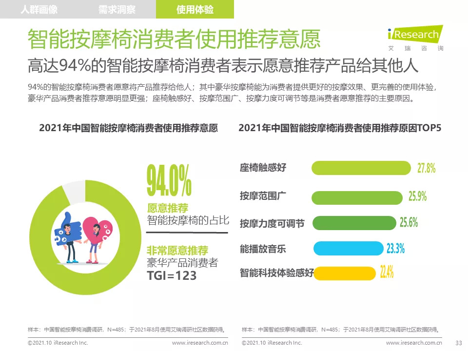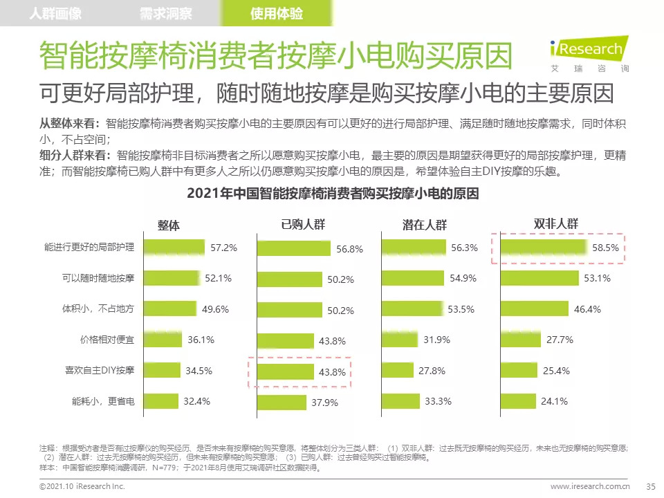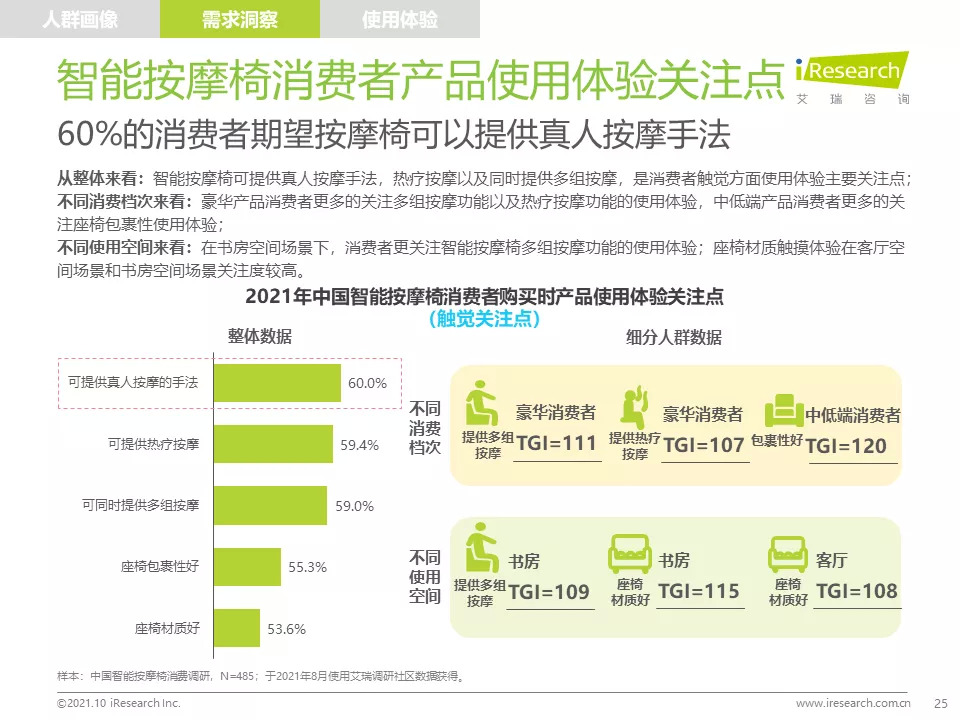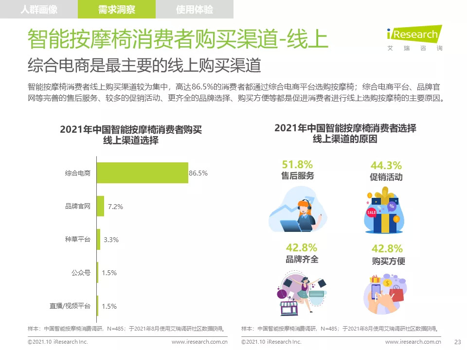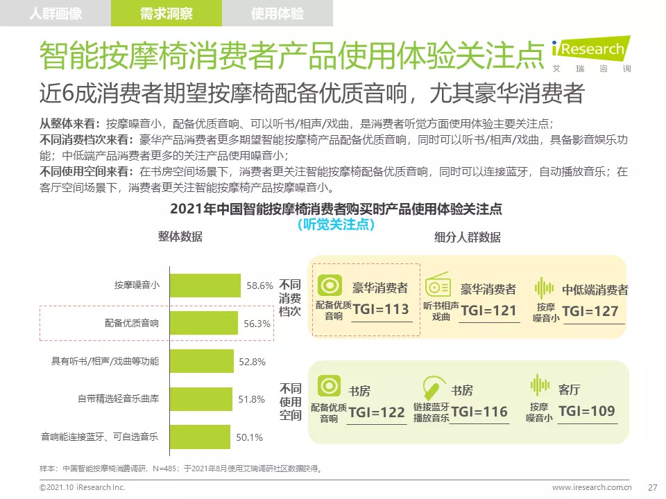 高线城市中,高知、高收入的中青年人群是主要消费者,他们拥有健康消费理念,注重品质,对知名品牌情有独钟;由于长期久坐,缺乏运动带来亚健康问题,消费者颈肩背部按摩需求强烈,也有很多消费者希望通过使用按摩椅放松舒缓身心,改善睡眠;消费者在购买智能按摩椅时,更愿意购买那些专业研发按摩椅、口碑好、知名度高的品牌产品,此外,高端及豪华消费者更喜欢智能科技感强的按摩椅产品