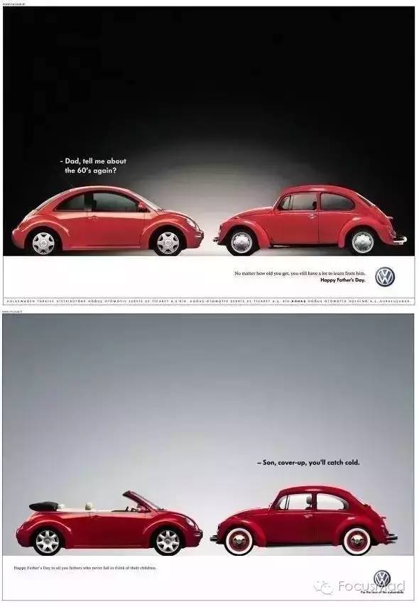 大众甲壳虫则站在产品角度,让儿子(现代车型)和父亲(60年代车型)展开对话。
