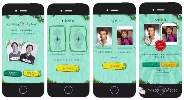 腾讯父亲节特供“亲子分析仪”,进入游戏自主选择,插入图片用H5人脸识别技术完成游戏,出结果后还会附带奖励。