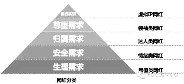 网红=颜值的这种阐释太表面化。对于网红的分类,可从用户认知和需求角度来划分,基于马斯洛需求理论,这张图你会明白: