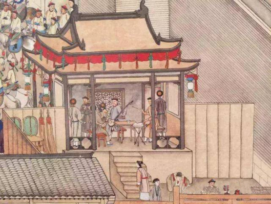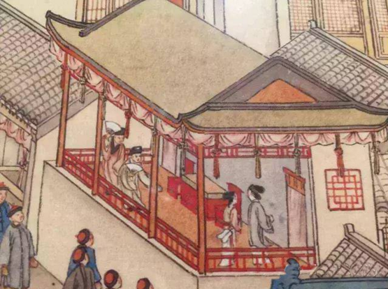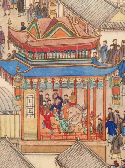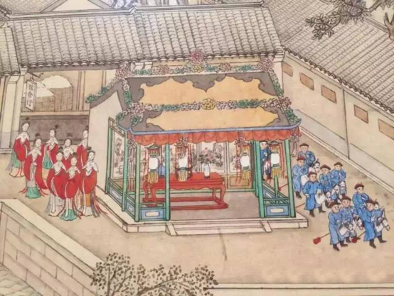 ▲戏台左边的着红衣绿裳的仕女,右边骑车假马的护卫,这么大的排场,不知是哪位大人物呢?