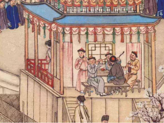 ▲台前聚集了鲜衣怒马的皇家护卫,后台坐着琴师和鼓师。
