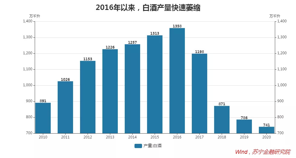 就市场整体而言,白酒产业并不值得期待。随着人口拐点的来临和民众健康意识提升,适度饮酒、健康饮酒渐成主流,啤酒、葡萄酒、保健酒和果酒等低度酒市场需求增加,白酒消费需求下降,传导至生产端,便是白酒产量快速萎缩。