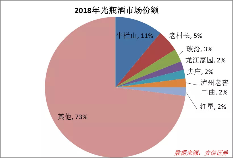 从市场占有率看,牛栏山和老村长是行业龙头,2018年在光瓶酒市场中的占有率分别达到11%和5%。头部品牌依靠营销投入打响品牌,借助电商渠道、完备的经销商体系实现跨区域布局,持续挤压地产酒的市场份额,强者恒强,推动市场集中度逐步提升。