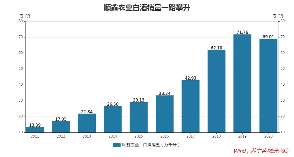 以顺鑫农业为例,虽然2016年以来白酒行业产量缩水45%,但顺鑫农业白酒销量却逆势而上,实现翻倍增长。2020年,公司白酒销量69万千升,位居上市酒企前列,在整个白酒行业占比已接近10%。