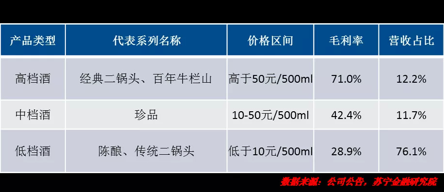 当前,围绕清香型“二锅头”和浓香型“百年”两大系列,牛栏山已形成了涵盖低、中、高端的700余种单品。其中,陈酿系列定位于低端,是公司销量最突出的单品;珍品系列定位于中端,“经典二锅头”和“百年牛栏山”系列定位于高档。