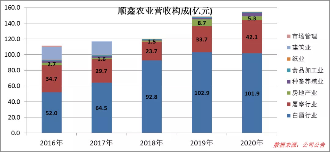 看企业名字,很多人第一反应这是一家农林牧渔公司。的确,顺鑫农业并非一家纯粹的白酒公司,还是一家生猪养殖、屠宰和肉食加工企业(以屠宰为主),同时还有少量处于亏损状态的待剥离房地产业务。