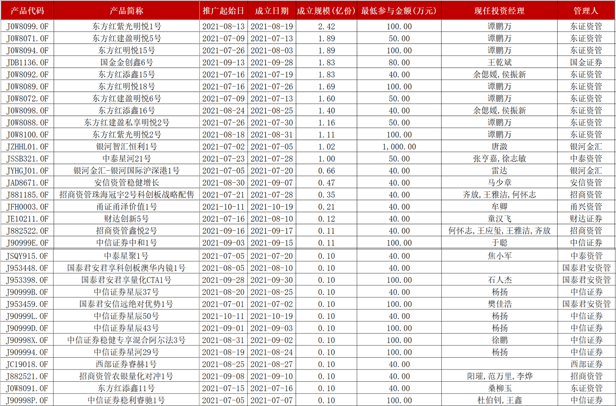 具体来看,混合类资管产品中,成立规模最大的3只均来自于东证资管,东方红紫光明悦1号、东方红建盈明悦5号、东方红明悦15号成立规模分别为2.42亿份、1.89亿份、1.89亿份。成立规模仅为1000万份的有13只,多只出现中信证券的身影。