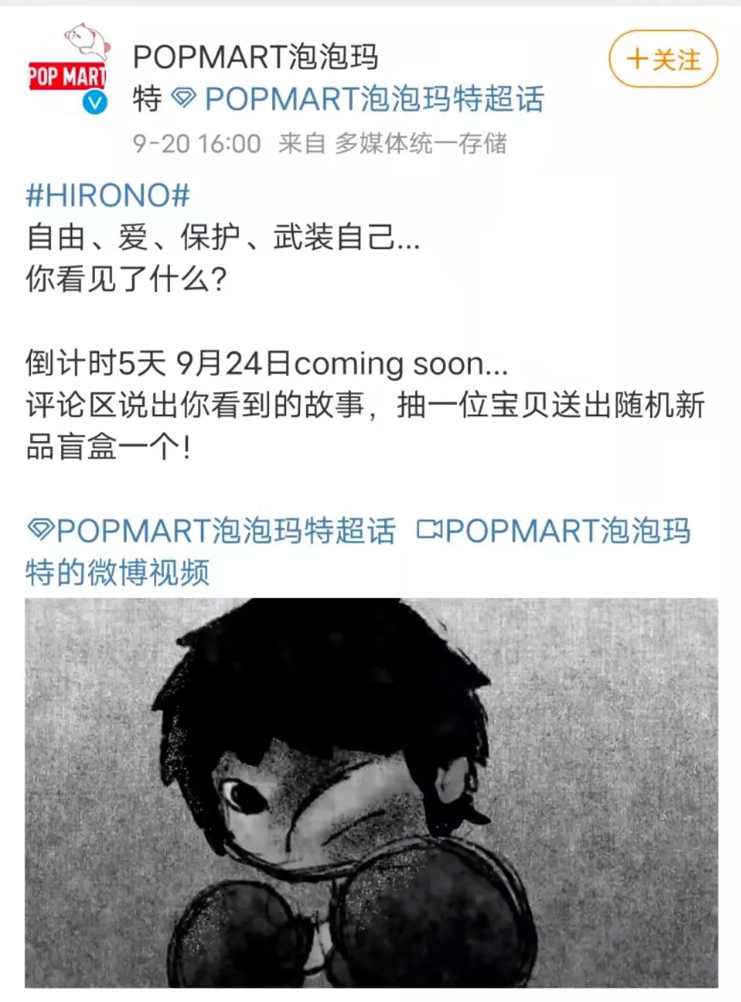 然而另一边,IP形象开发界的常驻玩家泡泡玛特却开始讲起了故事。9月20日,泡泡玛特官方微博预告了新IP小野hirono即将上线的消息。不同以往的是,泡泡玛特为小野量身打造了人物故事,并以系列短片的形式加以呈现。