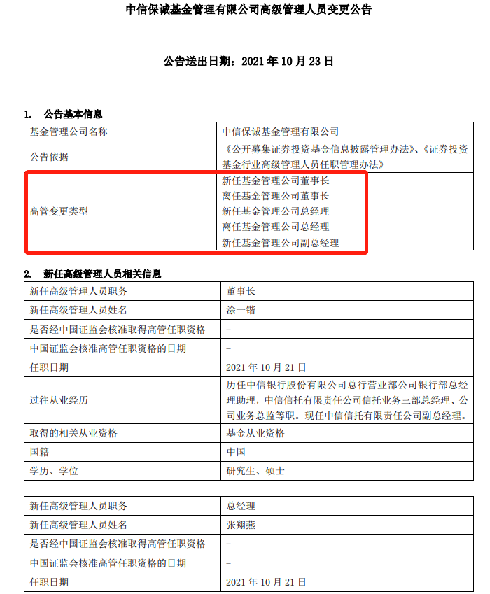 10月23日,中信保诚基金发布公告称,新聘涂一锴为公司董事长。公开资料显示,涂一锴现任中信信托副总经理。
