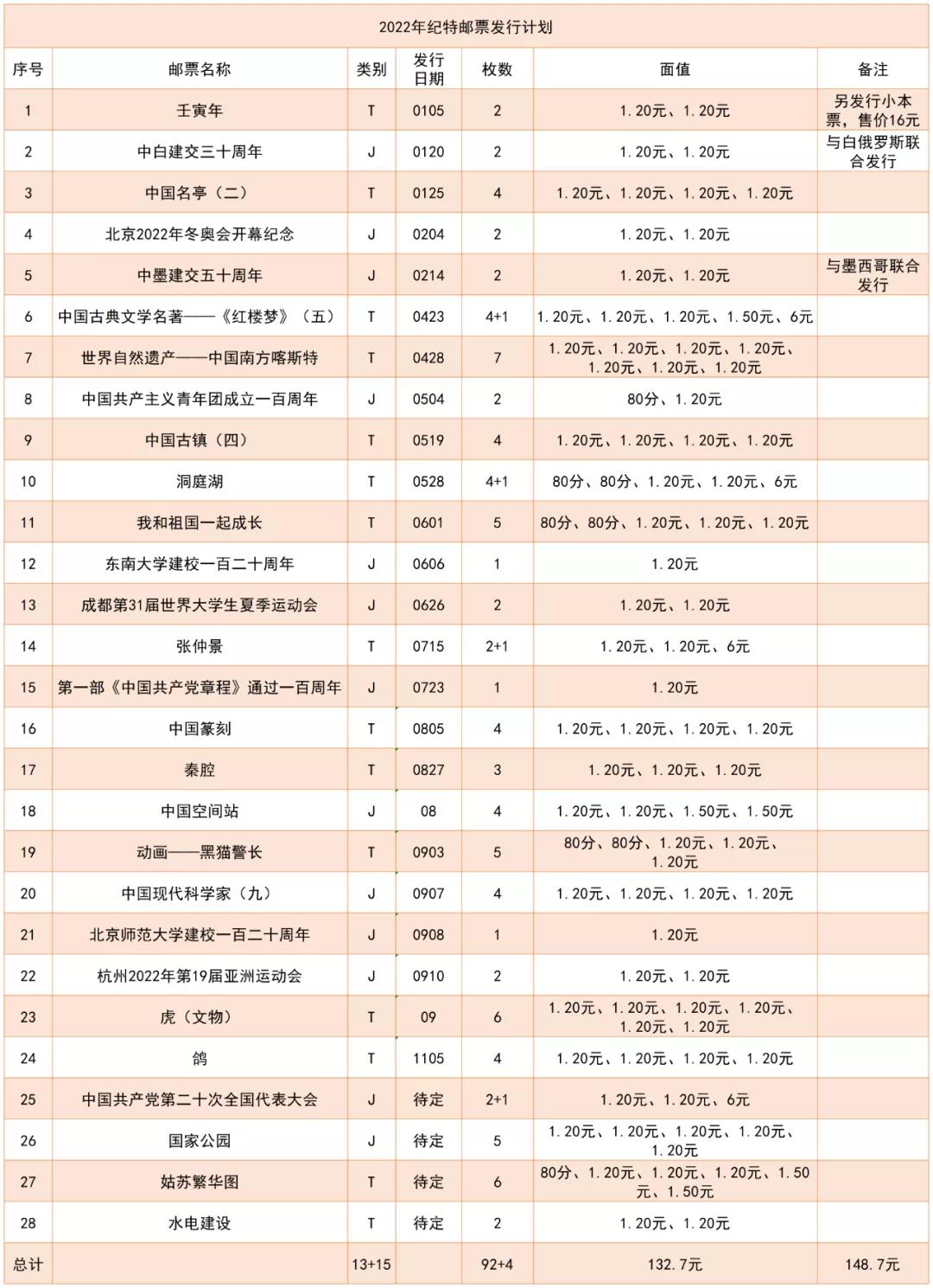 经国家邮政局局长办公会议审定,2022年纪特邮票发行计划计28套,其中纪念邮票13套,特种邮票15套。