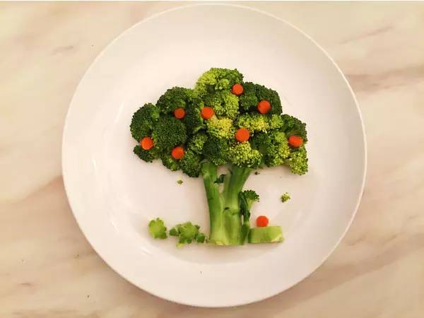 取一只白色空盘,西兰花摆成大树形状,胡萝卜作为枝叶的点缀。