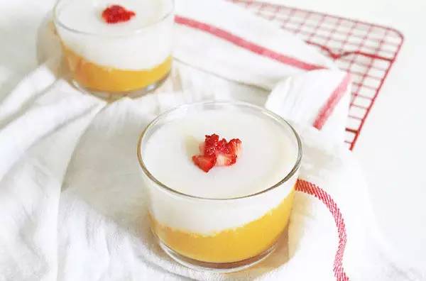 将玻璃杯倾斜45°,倒入芒果汁,冷冻30分钟至凝固状后加入牛奶,冷藏2小时以上即可。