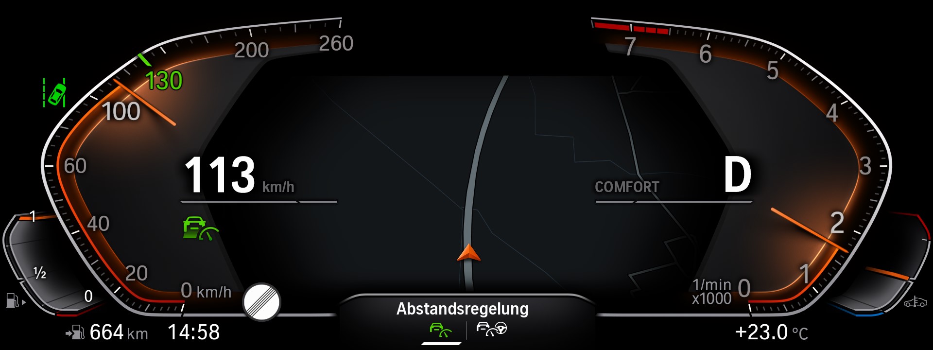 Assisted View功能可理解为“可视化效果拓展包”,当车辆使用ACC时,组合仪表可显示车辆探测到的行车道及左右车道的车辆情况,并具体地显示出轿车、货车或摩托车的不同车型。该功能在中国本土智能电动车,如蔚来和小鹏上已经实现。