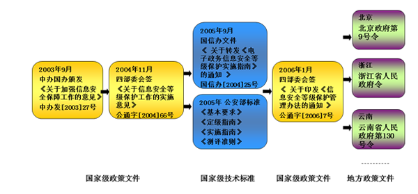 随着我国信息技术的快速发展,为维护国家安全和社会稳定,维护信息网络安全,国务院于1994年颁布了《中华人民共和国计算机信息系统安全保护条例》(国务院147号令)。条例中规定:我国的“计算机信息系统实行安全等级保护。2003年中央办公厅、国务院办公厅转发的《国家信息化领导小组关于加强信息安全保障工作的意见》(中办发[2003]27号)明确指出“实行信息安全等级保护”。2007年公安部会同国家保密局、国家密码管理局和国务院信息化工作办公室下发《信息安全等级保护管理办法》(公通字[2007]43号)明确规定“定期对信息系统安全等级状况开展等级测评”。“第三级信息系统应当每年至少进行一次等级测评,第四级信息系统应当每半年至少进行一次等级测评……”。并制定了包括《计算机信息系统安全保护等级划分准则》(GB17859-1999)、《信息系统安全等级保护定级指南》、《信息系统安全等级保护基本要求》等50多个国家标准和行业标准,形成了信息安全等级保护标准体系。具体如下图所示: