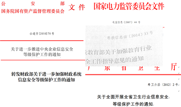 随着国家相关机关不断出台等级保护规范标准,各行业或监管部门迅速发文响应并落实行业内信息系统安全等级保护工作。例如,卫生部2011年印发(卫办发[2011]85号)《卫生行业信息安全等级保护工作的指导意见》的通知,明确卫生行业信息系统实行“定级备案、建设与整改、等级测评”工作。中国人民银行2012年制定了《金融行业信息安全等级保护测评服务安全指引》、《金融行业信息信息系统信息安全等级保护测评指南》和《金融行业信息系统信息安全等级保护实施指引》,2013年制定了《征信机构管理办法》(中国人民银行令[2013]第1号),明确和规范金融机构开展的信息系统安全等级保护测评工作。教育部2014年发布《教育部关于加强教育行业网络与信息安全工作的指导意见》(教技[2014]4号)明确规定“各单位信息系统要按照教育行业有关规范准确定级和备案”,“按照国际和教育行业有关标准规范要求进行等级测评”。还有财政部、人力资源社会保障、交通运输行业、电力行业等监管部门或行业都发布相应文件明确落实信息系统安全等级保护工作,建立、健全信息安全管理制度,落实安全保护技术措施,全面贯彻落实信息安全等级保护制度。
