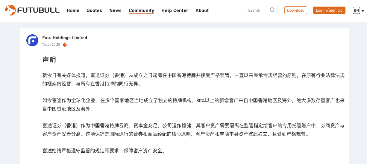 富途控股10月28日晚间发布声明称,就今日有关媒体报道,富途证券(香港)从成立之日起即在中国香港持牌并接受严格监管,一直以来秉承合规经营的原则,在原有行业法律法规的框架内经营,与所有在香港持牌的同行无异。富途证券(香港)作为中国香港持牌券商,资本金充足,公司运作稳健,其客户资产需要隔离在监管指定给客户的专用托管账户中,券商资产与客户资产妥善分离。