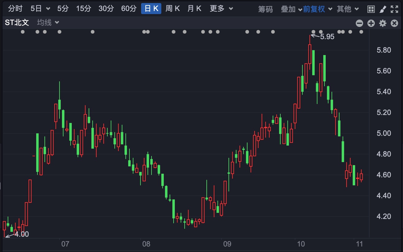 股东大会之后,ST北文股价在10月26日、27日连续两个交易日跌停。11月2日,ST北文股价收于4.57元,跟10月14日的近期最高收盘价5.85元相比,已经跌去21.88%。