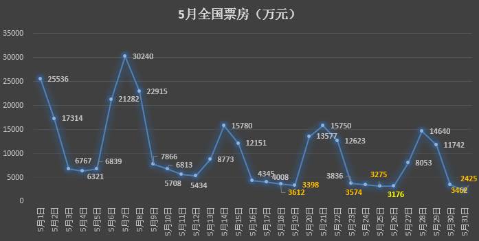 值得注意的是,5月以来单日票房还多次触底,跌出新低。先是5月18日第一次跌破除夕夜的3690万元,之后19日,24日,25日,26日,30日均跌破此记录,其中5月26日更是跌到3175.8万,创造了今年以来单日票房最低的新纪录。
