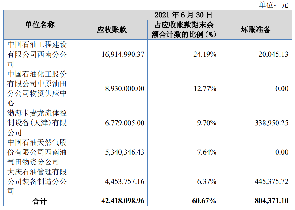 由于领域的特殊性,导致中寰股份对大客户有“依赖症”,光是前五客户的销售额,就占了收入的近七成。报告期内(2018年至2021年上半年),按同一控制口径合并的公司前五大客户销售占比分别为67.58%、74.67%、62.58%和69.07%,而对中石油集团及其下属公司的销售收入占比分别为45.08%、55.32%、36.97%以及41.48%。而与此同时,应收账款也会受此影响。比如2021年上半年,应收账款前五中均与中石油有关。