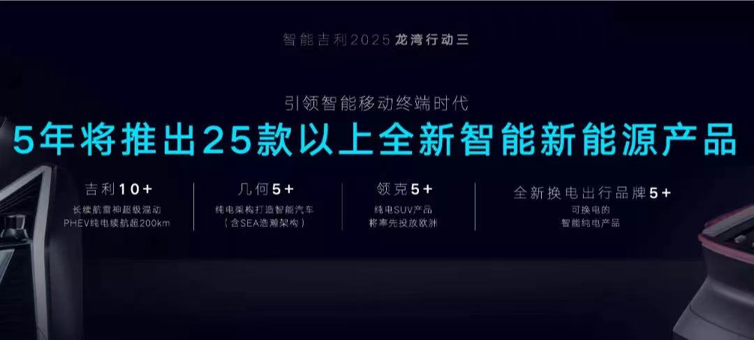 龙湾行动五:2025海外销量达到60万辆。吉利品牌将重点布局东欧、中东、东南亚、非洲、南美等“一带一路”国家,构建全球600+海外销售网点,进军欧洲、亚太新能源市场。