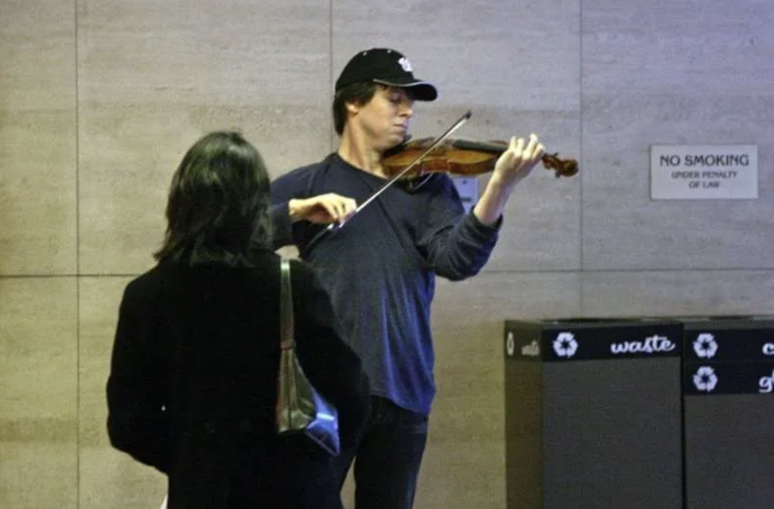 一个衣着普通、头戴鸭舌帽的街头艺人,在周五早上人来人往的华府地铁站,拉着招徕听众的小提琴曲。他脚边放着收钱的琴盒,四周则是来去匆匆的上班族。他整整演奏了四十多分钟,只有七个人停下脚步驻足听了片刻,二十七位路人往琴盒里扔了钱,一名三四岁的男孩想多听一会儿,被急于送他上幼儿园的母亲硬拉走了。