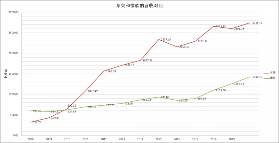 2010年,当苹果的营收超越微软时,两家公司的市值完成同步换位。到2013年,微软的市值缩水到3000亿美元左右,而苹果则在反超微软后继续高歌猛进。