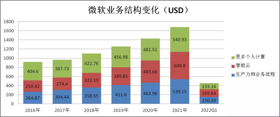 根据最新的财报,2022财年Q1,公司智能云板块的营业收入达到170亿美元,成为业绩的最大支柱,而囊括了Windows系统、搜索和游戏的个人计算板块的营业收入只有133亿美元。