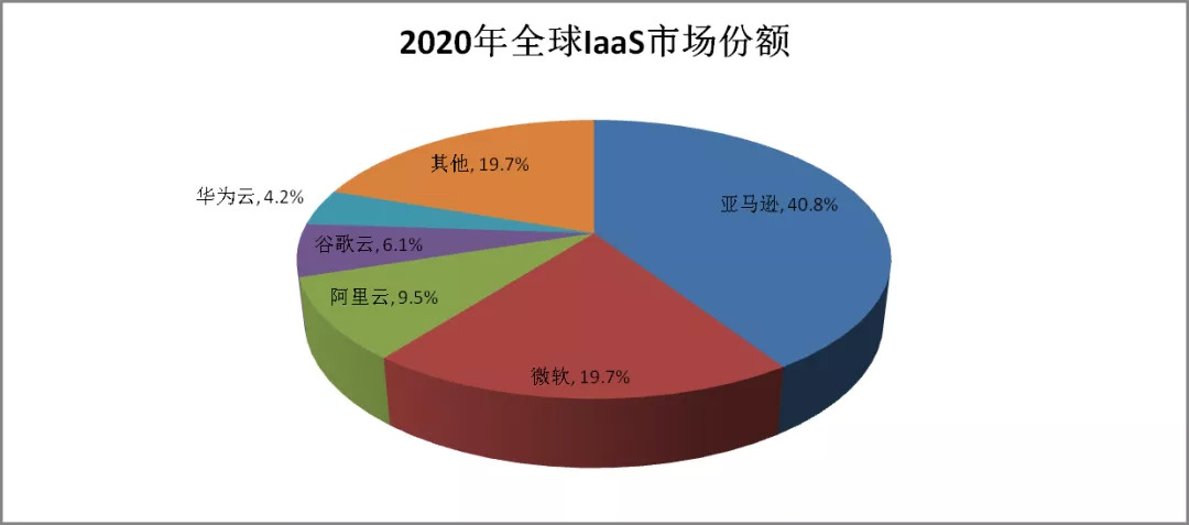 Gartner的数据显示,2020年,全球云计算市场继续保持高速增长,其中IaaS市场规模达642.86亿美元,同比增长40.7%,亚马逊、微软、阿里排名前三,且市场还在进一步向头部集中。