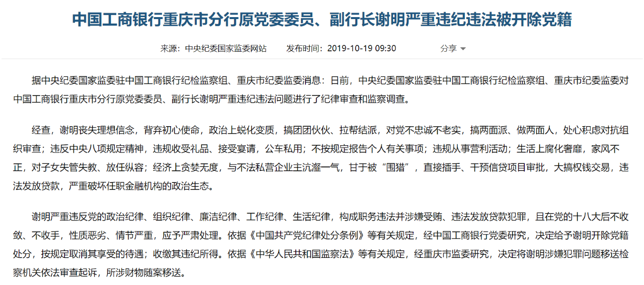 这是工行推进以案促改、以案促治的一项举措。中央纪委国家监委驻中国工商银行纪检监察组自2019年1月成立后不久,即联合地方纪委监委严肃查处了工行上海分行原党委书记、行长顾国明,重庆分行原党委委员、副行长谢明严重违纪违法案件。通报称,谢明“经济上贪婪无度,与不法私营企业主沆瀣一气,甘于被‘围猎’,直接插手、干预信贷项目审批,大搞权钱交易”。对顾国明的一审判决显示,其利用分管工行上海分行授信审批部、信贷管理部、主持全行工作等职务便利,为相关单位和个人在办理融资贷款、项目配资、承揽工程等事项上提供帮助,谋取利益,共计收受贿赂折合人民币1.36亿余元。