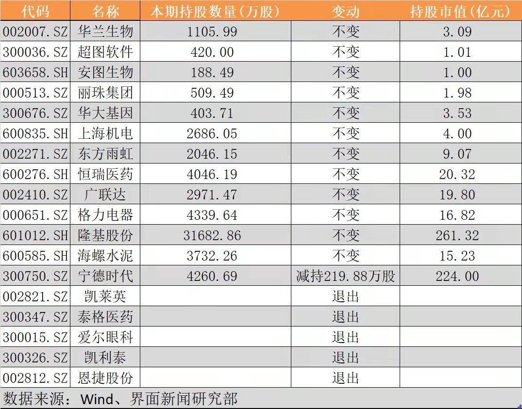 Wind提供的数据显示,三季度高瓴退出了5家上市公司的十大股东,其中包括4只医药股以及1只锂电概念股,小幅减持宁德时代(300750.SZ),无一例加仓。