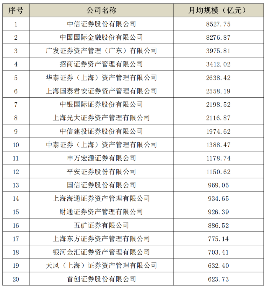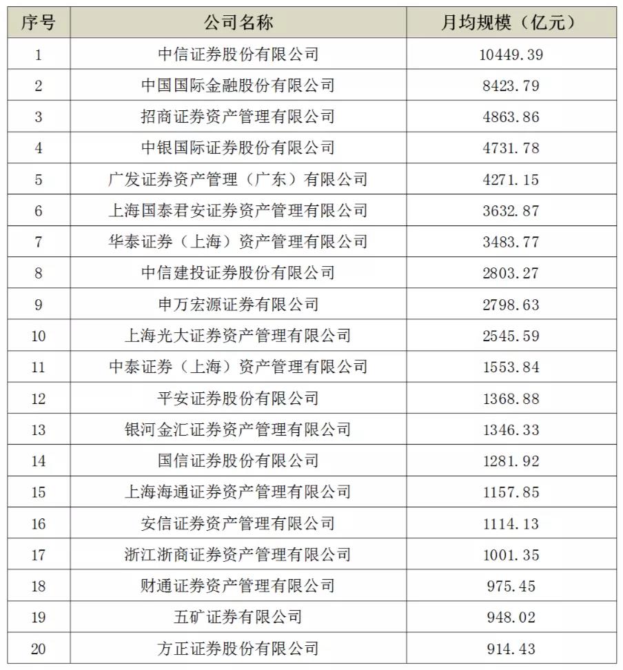 在私募资管业务方面,中信证券稳居榜首。中国基金业协会最新公布的2021年三季度证券公司私募资产管理月均规模前20家数据显示,中信证券以10449.39亿元的月均规模位列第一,中金公司位列第二,月均规模8423.79亿元。此外,招商资管、中银证券、广发资管月均规模均超4000亿元。