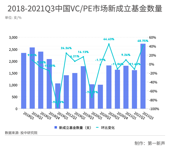 投中研究院统计,2021年三季度,中国VC/PE市场新设基金2730支,与19年起的近几期及基金数量相比,接近于翻倍上涨,更是突破了18年二季度2574支的历史记录。细分数据下,7月、8月、9月分别新设基金987支、867支、876支;均高于往期月度新设数量。