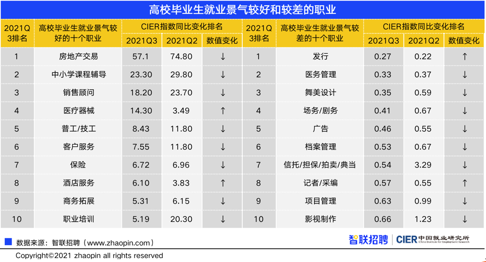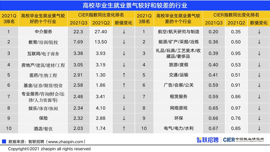 报告显示,三季度就业最好的行业为中介服务业,CIER指数为22.3。就业景气指数最低的行业为航空/航天研究与制造业,CIER指数为0.2。