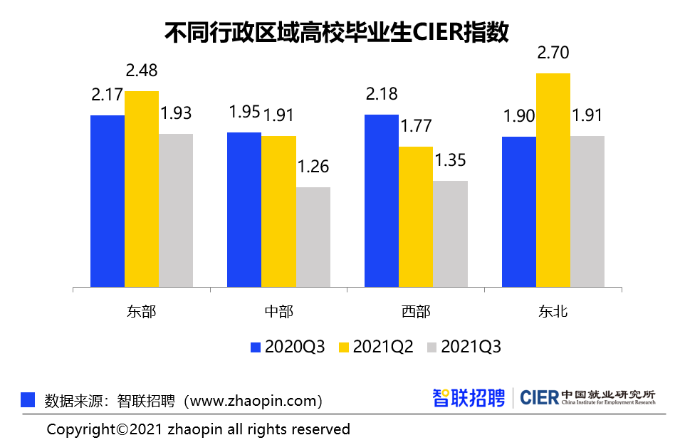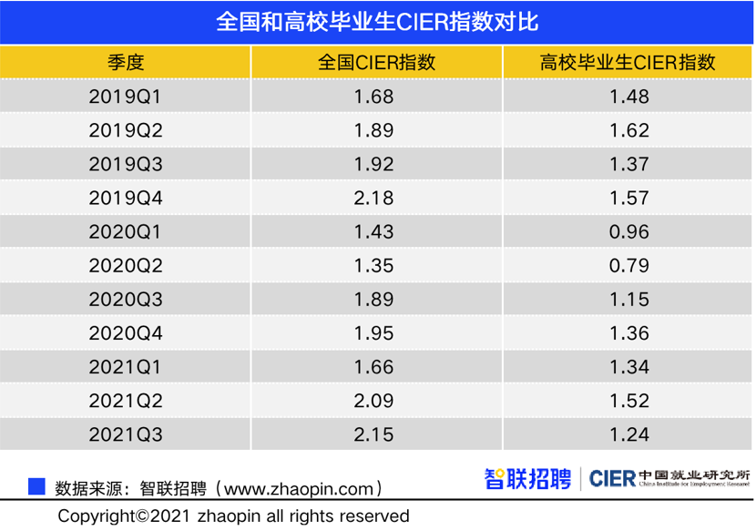 同比来看,三季度全国CIER指数由1.89上升至2.15;高校毕业生CIER指数由1.15上至至1.24。