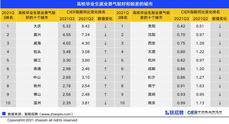 二三线城市中,大庆、嘉兴、威海、包头、镇江等城市的高校毕业生就业景气较好。