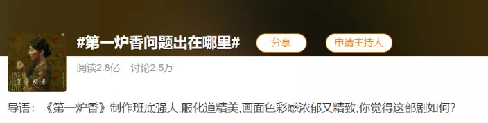 10月26日,一条#第一炉香问题出在哪里#的微博话题冲上热搜,短短数小时阅读量高达2.4亿,讨论次数达2.2万。从吐槽选角的“第一炉钢”到吐槽台词的“青春疼痛文学”,网友的 “狂欢式吐槽”甚至比电影精彩。10月28日,画风有所转变,“第一炉香评论两极化”冲上热搜,部分网友表达了电影并没有那么糟糕、应该避免跟风黑的观点。