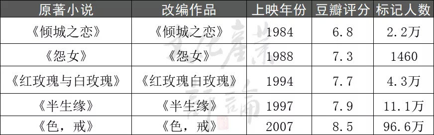 整体来看,尽管张爱玲在文坛有着重量级的地位,但由其作品改编而成的影视作品却数量较少,并且始终难以摆脱票房魔咒。