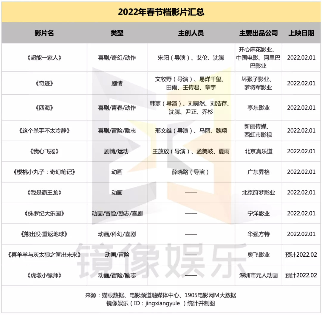 可以看到的是,此次春节档大制作、大导演集体缺席,新贵电影公司、新锐影人成为了主力。