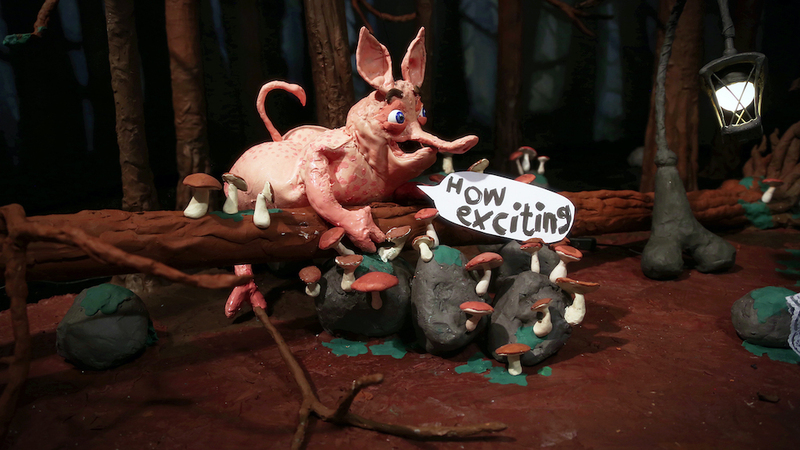 “牛皮纸包裹的月亮”是瑞典艺术家组合Nathalie Djurberg和Hans Berg共同构思的特定场域展览,展览标题致敬了英国诗人Carol Ann Duffy的诗歌《情人节》。两位艺术家从2004年起合作创作,Djurberg开启了基于木炭和粘土定格动画的影片风格,Berg负责为其影片和装置创作符合氛围的配乐。他们的作品有股难以言喻的荒诞感,对白和故事情节近乎失去逻辑,人类、动物与怪物的界限模糊不清。