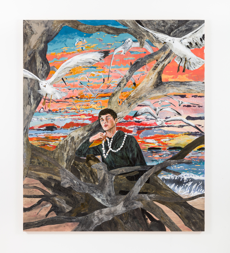 从展出的作品中,我们可以看出近20年来巴斯绘画风格的变化。在其早期的作品中,融合抽象表现和装饰图案的超现实景观几乎将人物吞噬其中。而近年来的作品(特别是创作于2020-2021年的新作)倾向于以人物为画面主体描绘,以细腻的笔触和逼真的背景刻画出一个个充满戏剧张力,甚至略带魔幻色彩的场景。在创作于2020年的《爆米花项链》中,一个身着黑衣的男孩倚靠着海岸边的枯树,把玩胸前的爆米花项链,神情睥睨宛若王座上的君王,身后的夕阳将天空晕染成橙红色,为他镀上壮丽的光晕。然而爆米花和华贵项链格格不入,四周飞舞的海鸥仿佛也在觊觎,尖利的喙直指男孩。某种平衡即将被打破的紧张感让这张画作异常有趣。