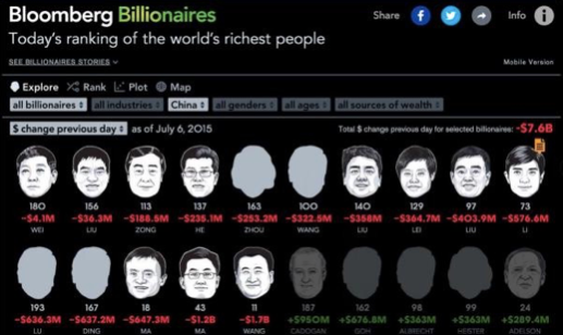 据福布斯统计,仅2015年上半年,中国大陆就诞生了50多位亿万富豪(资产价值在10亿美元以上,billionaire),含女性富豪8位,夫妻富豪4对,家族企业1个,其中新晋一位中国女首富——蓝思科技董事长周群飞。然而,在经历了6-7月股市动荡后,这50人中仅剩下19人保持住了亿万富翁的家底。