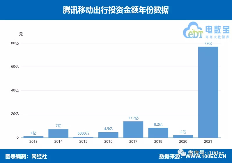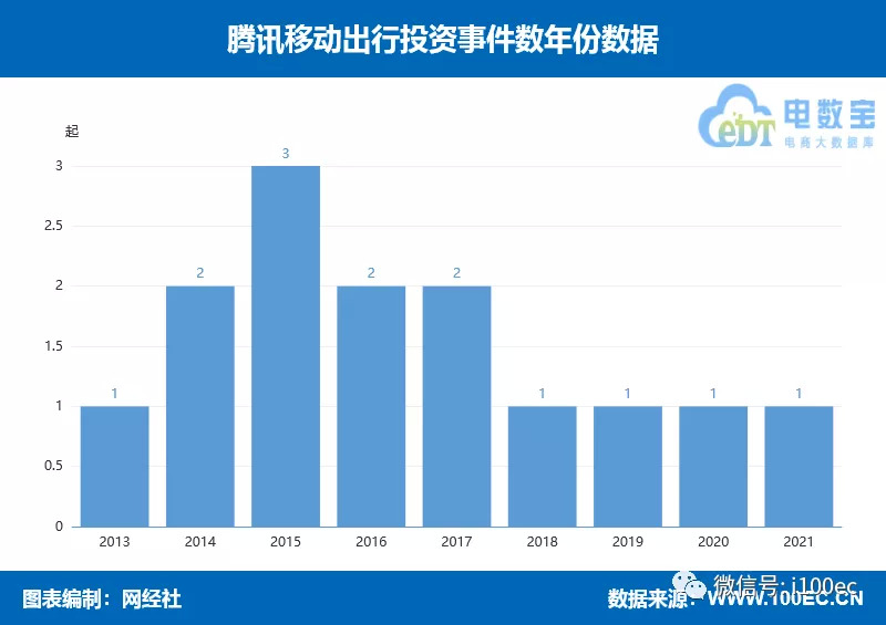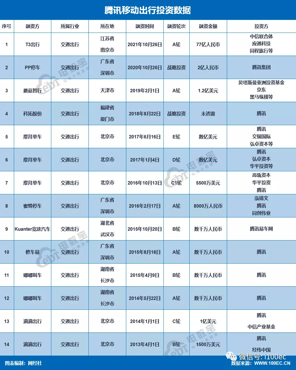 据网经社“电数宝”(DATA.100EC.CN)大数据库显示,2013年4月1日至2021年10月26日,腾讯累计参与了14起移动出行平台的投资,涉及公司分别为:滴滴出行、T3出行、PP停车、蘑菇智行、科拓股份、摩拜单车、蜜蜂停车、Kuanter宽途汽车、修车易、嘟嘟叫车。