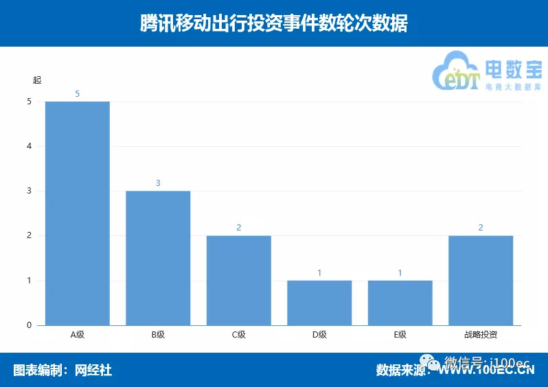 数据统计发现,在腾讯移动出行的投资中,A级5起、B级3起、C级2起、D级1起、E级1起、战略投资2起。