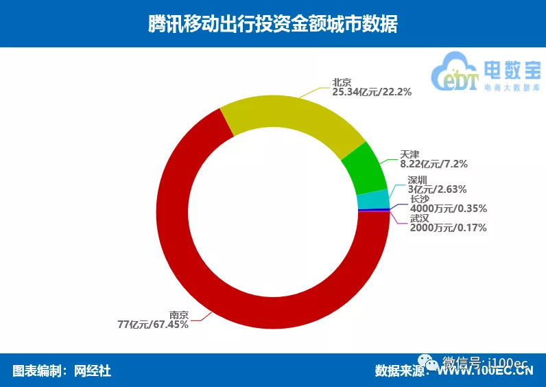 数据统计发现,腾讯参与投资的公司中,南京公司获得投资77亿元,占比67.45%。此外依次为北京25.34亿元、天津8.22亿元、深圳3亿元、长沙4000万元、武汉2000万元。