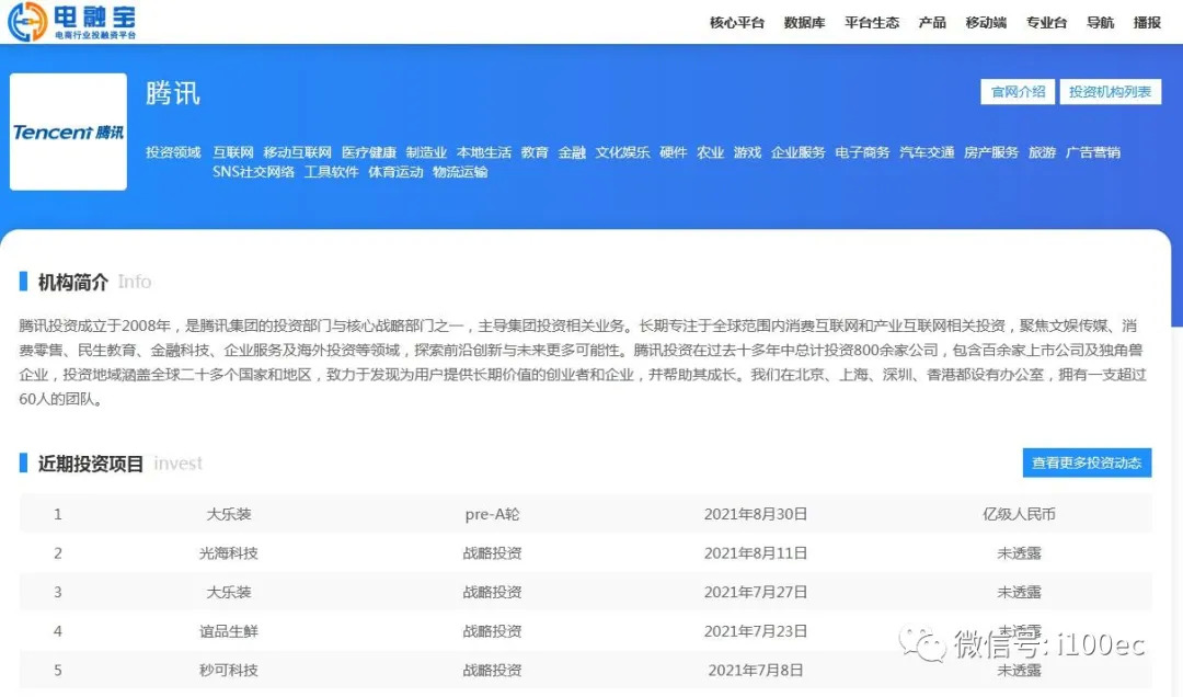 据网经社“电融宝”投资方库显示,腾讯投资成立于2008年,是腾讯集团的投资部门与核心战略部门之一,主导集团投资相关业务。长期专注于全球范围内消费互联网和产业互联网相关投资,聚焦文娱传媒、消费零售、民生教育、金融科技、企业服务及海外投资等领域,探索前沿创新与未来更多可能性。