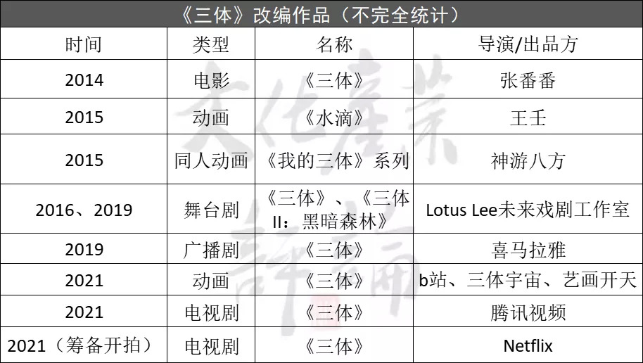 其实,这不是科幻作品《三体》的改编首秀,除了腾讯版电视剧《三体》之外,还有Netflix预期在2021年11月开拍的同名电视剧、广播剧《三体》、动画《我的三体》系列等等,以及由张番番、田晓鹏两位导演分别拍摄的两部《三体》真人版电影(皆未面世)。