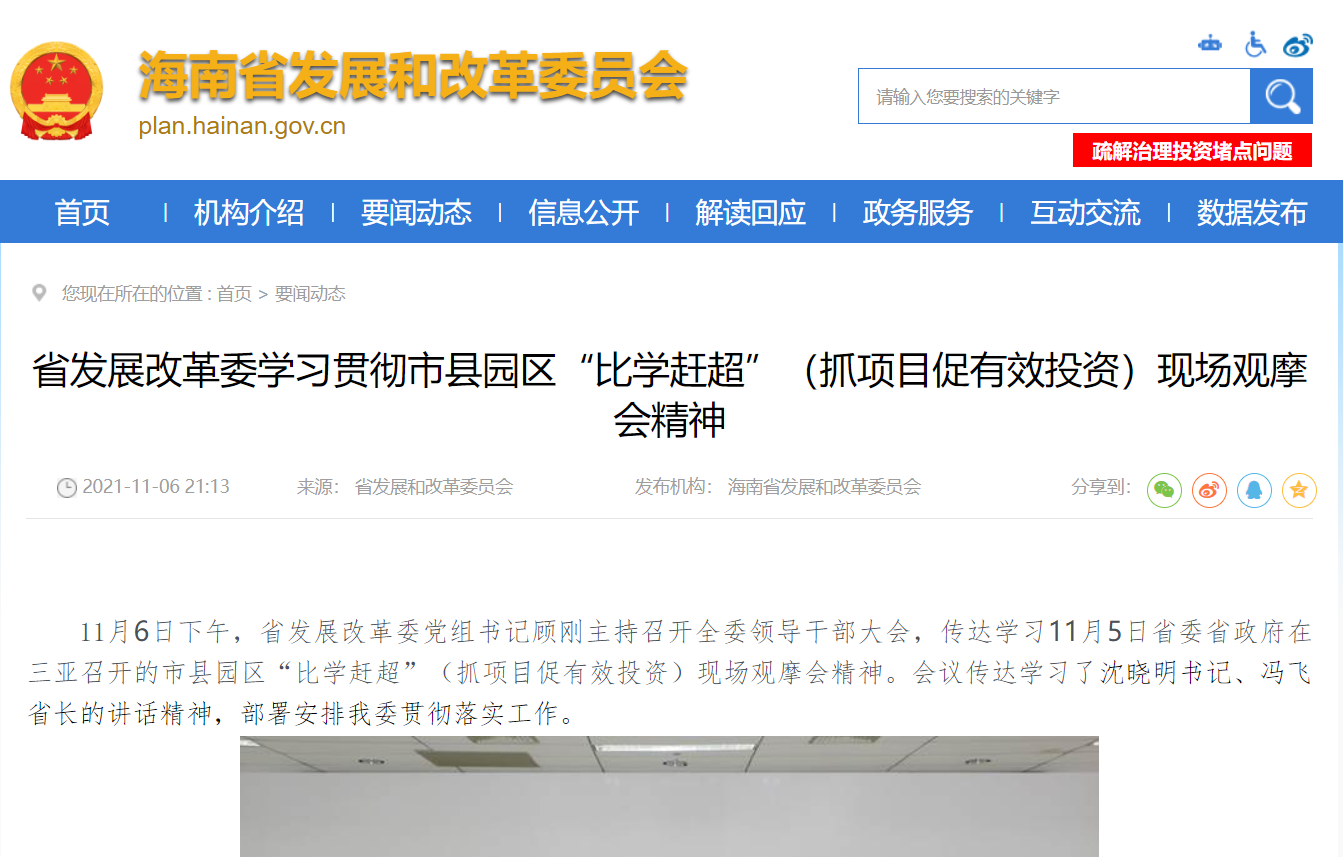 据海南省发改委网站消息,11月6日下午,省发展改革委党组书记顾刚主持召开全委领导干部大会,传达学习11月5日省委省政府在三亚召开的市县园区“比学赶超”(抓项目促有效投资)现场观摩会精神。
