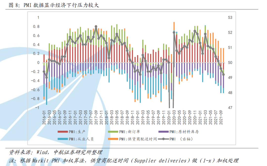 各项数据显示当前经济下行压力较大,即便如此,我们认为PMI数据仍未准确完整的反应经济下行压力:纳入PMI加权计算中的分项数据中,仅“供应商配送时间”对PMI进行正向拉动。经济活动的活跃程度可以从供应链的繁忙程度侧面印证。常规时期中,供应商交付应与其他分项数据尤其是新订单走势相匹配,但是疫情所致的封锁使得供应商交付数据失真。供货商配送时间的拉长反应的是疫情导致的全球物流效率降低,而非供不应求。近期供应商配送时间已连续7个月对PMI进行正向拉动。10月PMI已回落至49.20,但PMI读数可能仍然高估了经济的景气程度。
